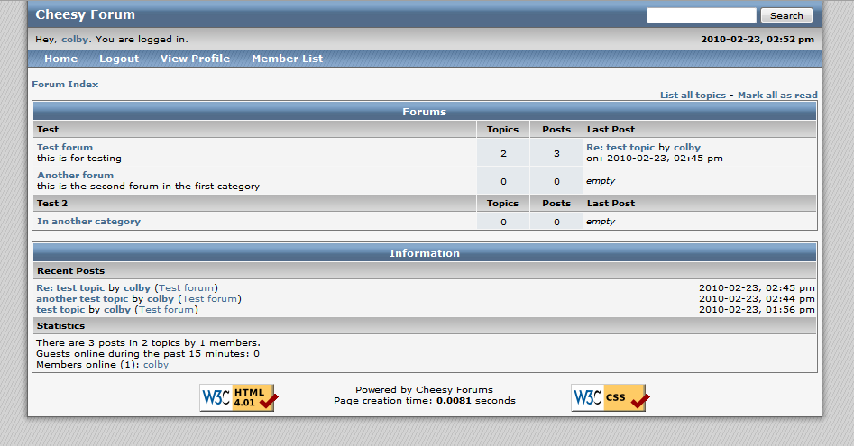 This was a PHP/MySQL forum that I created because I was unsatisfied with the current open source forum offerings. I couldn't find a nice balance between features and complexity. A lot of forums had all the features I could ever want, but presented them to the administrator in a way that felt overwhelming and cumbersome to me. Other, simpler, forums were missing features I wanted, and so I decided that rather than try to modify a forum and hope that it would work for me, I'd make my own to be sure that it would work for me.