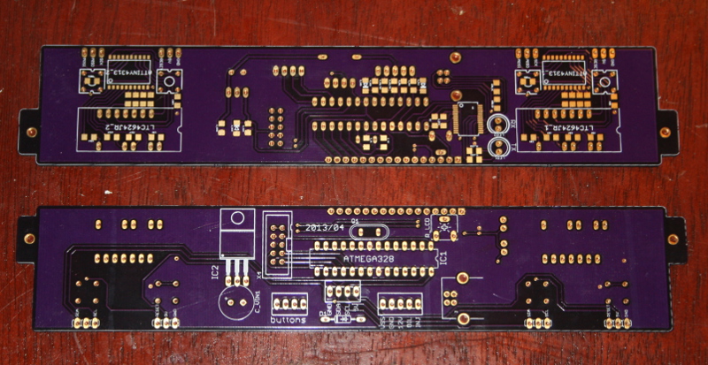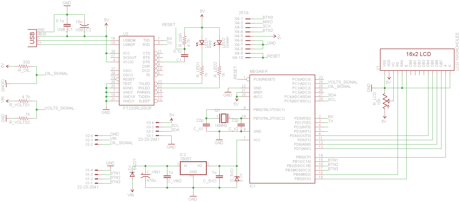 The project went through several revisions. The version I completed for the class consisted of two separate display PCBs with 7-segment displays -- one for each digital gauge -- with the rest of the the electronics being an Arduino Uno and a breadboard with some voltage dividers. The "final" version (if I don't revisit the project later) had all of the electronics on one PCB, abandoning the Arduino hardware for a standalone ATmega 328 microcontroller. This final version also included provisions for a 16x2 character OLED display. The reason for this is because I was interested in the MPGuino at the time and wanted to see if I could integrate it into my gauges.